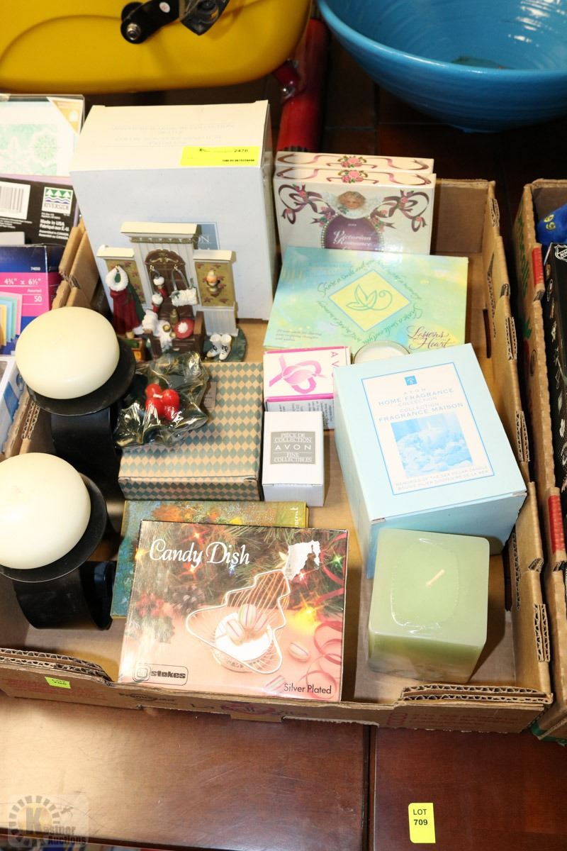 BOX WITH AVON CANDLE HOLDERS AND NEW ITEMS