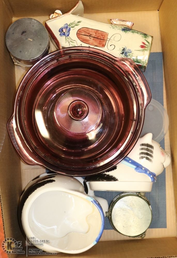 BOX WITH BAKEWARE, COOKIE JAR AND MORE