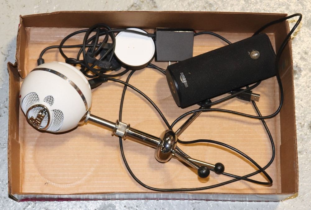 BOX WITH BLUE MICROPHONE AND AMAZON SPEAKER