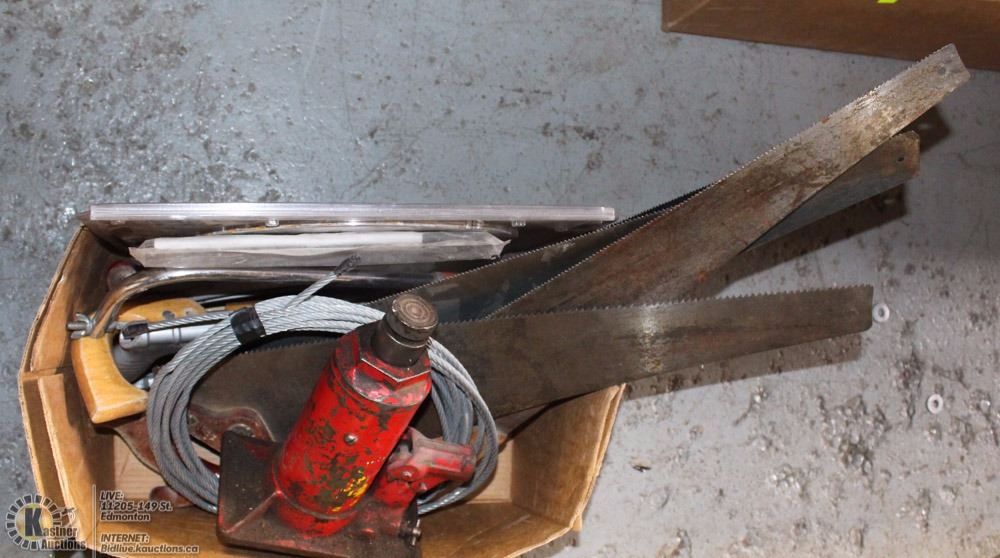 BOX WITH BOTTLE JACK, MISC SAWS AND SPARE BLADES