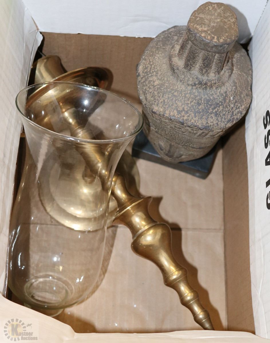 BOX WITH BRASS AND GLASS CANDLE WALL HANGING,