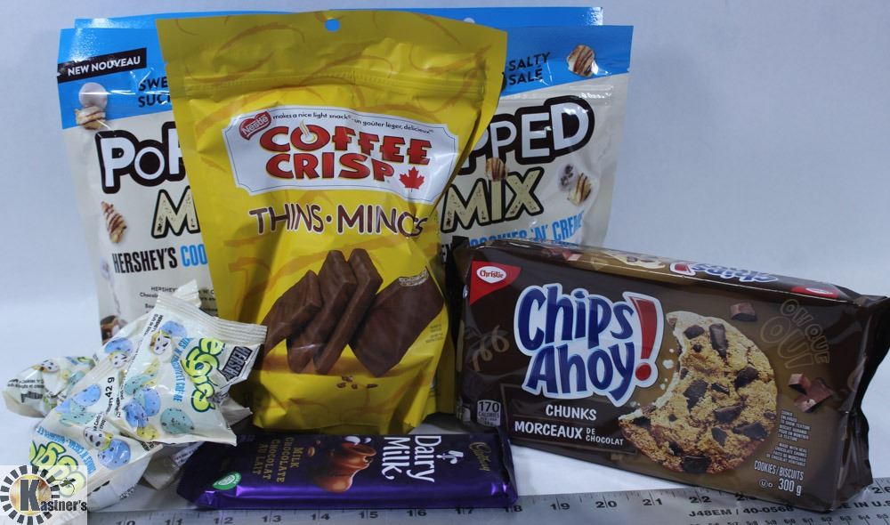 BOX WITH CHIPS AHOY, HERSHEYS EGGS, POPPED MIX