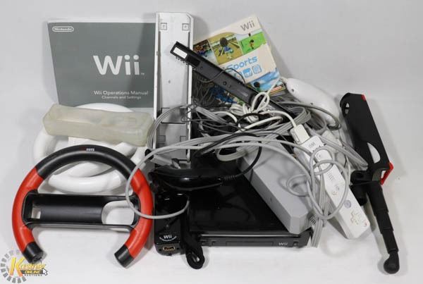 INCL. 4 REMOTES, 2 STEERING WHEELS, FISHING ROD, CORDS, WII SPORTS, ETC. - ELECTRONICS
