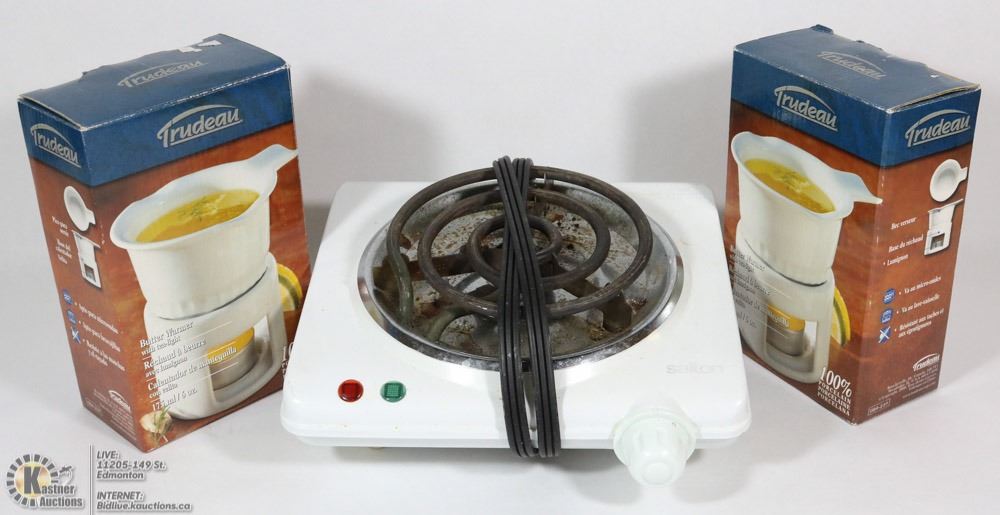 BOX WITH ELECTRIC BURNER & 2 NEW BUTTER WARMERS