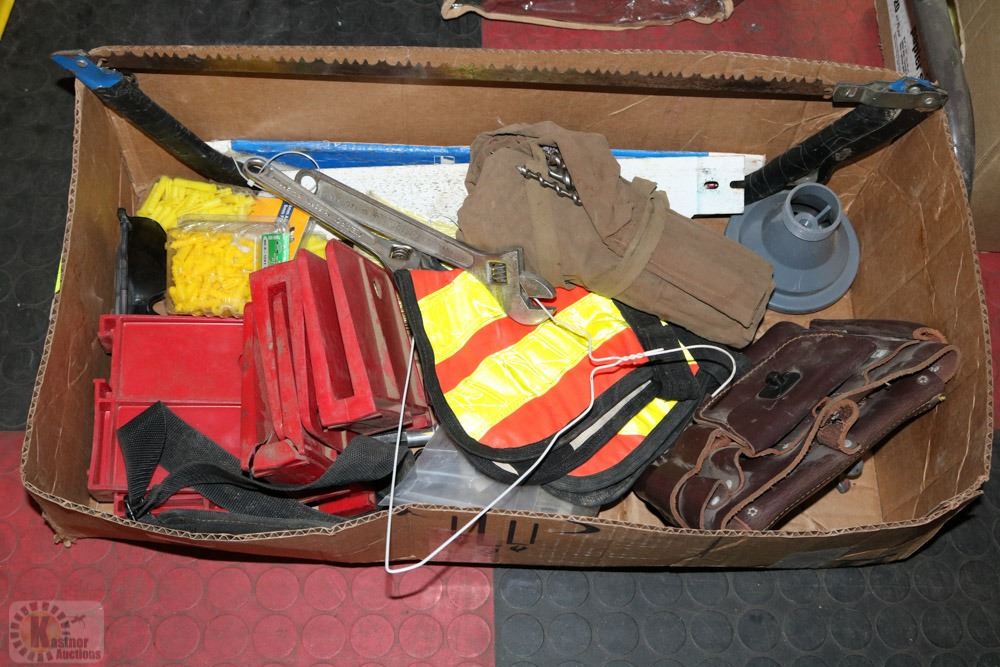 BOX WITH HANDSAW ,DRILLBITS,TOOLS,POUCHES,