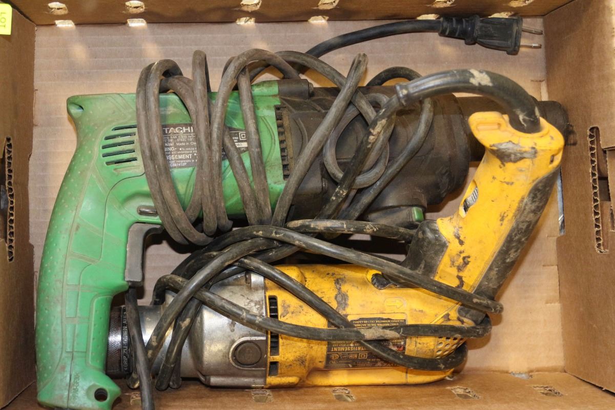 BOX WITH HITACHI DRILL & DEWALT DRILL
