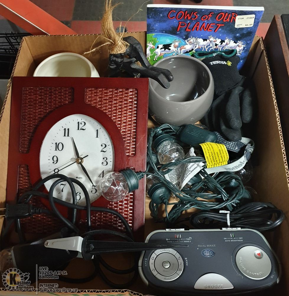 ALARM CLOCK, WOOD FRAMED WALL CLOCK, PATIO LIGHTS, COLOUR CHANGING OUTDOOR SPOT-LIGHT, WOOD FIGURINE, NEW GRIP GLOVES, PLANT POTS, ETC. - GENERAL, HOUSEHOLD