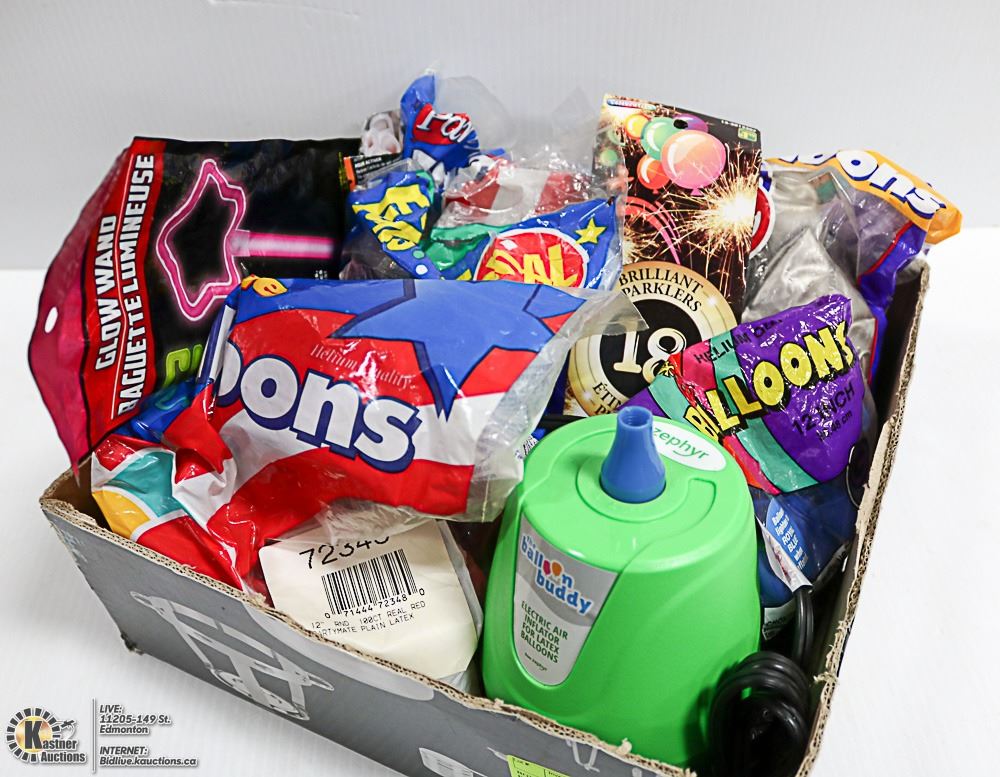 INFLATOR, 4 BAGS OF BALLOONS (RED, BLUE, WHITE & SILVER), SPARKLERS & TABLE CLOTH