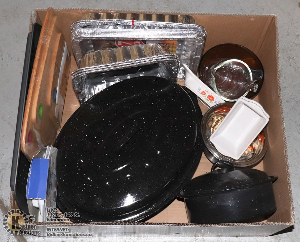 ENAMEL ROASTER, SMALL ROUND ENAMEL ROASTER, BAKEWARE, NEW 3-PC CUTTING BOARD SET, MIXING BOWLS, ETC. - GENERAL, KITCHENWARE