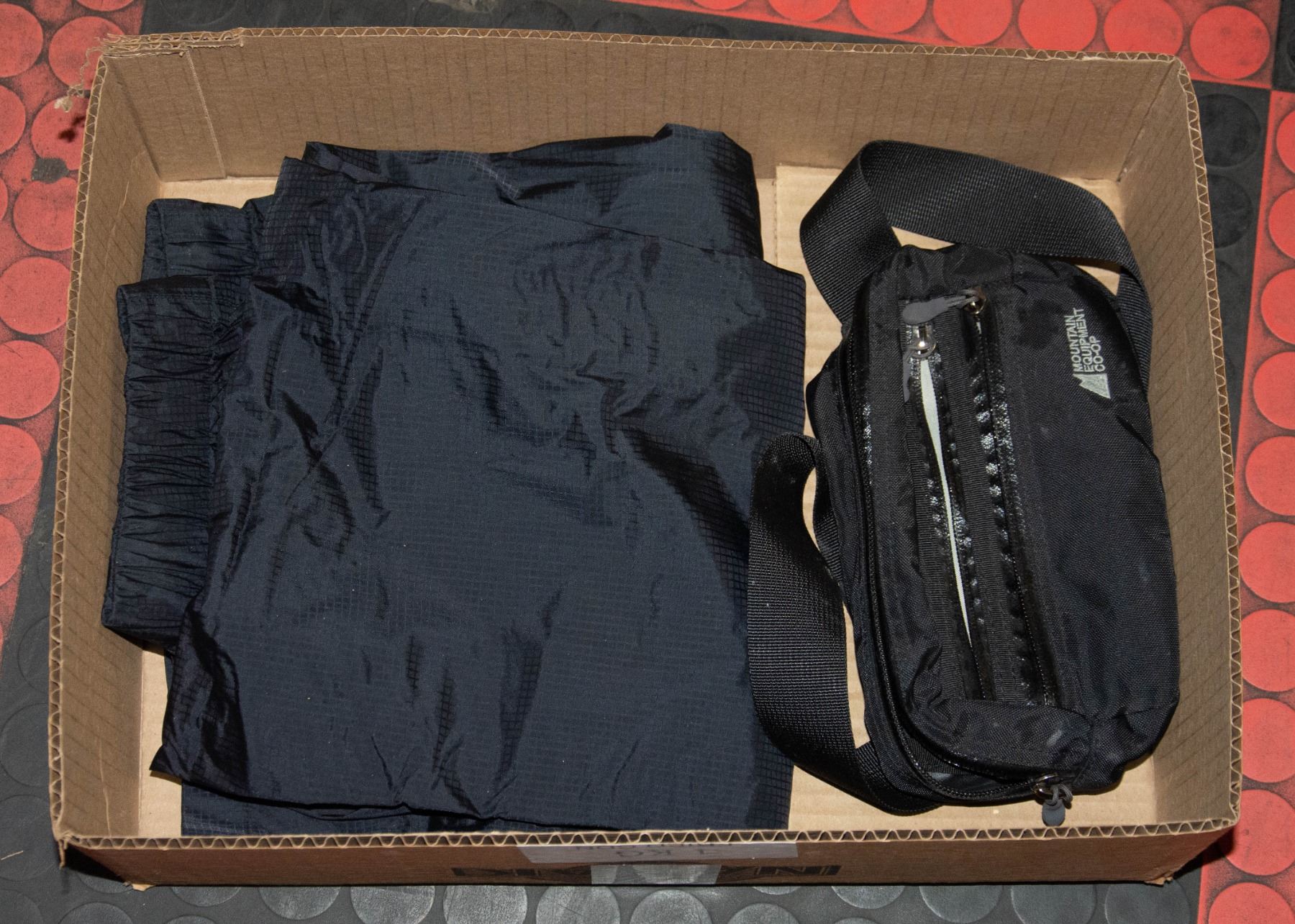 MEN'S SIZE SMALL WITH ELASTIC WAIST ALL WEATHER WATER PROOF PANTS (BLACK GRAPHITE PATTERN & FULL LEG ZIPPERS) AND MOUNTAIN EQUIP WAIST BELT PACK - MULTI ZIP POCKETS, WATER PROOF, ADJUSTABLE BELT **ALL ITEMS MUST BE REMOVED BY 5PM SATURDAY, MAY 20TH 2023. ALL REMAINING ITEMS WILL BE SUBJECT TO A $6.00 PER DAY STORAGE CHARGE. ANY ITEMS REMAINING AFTER MONDAY, JUNE 5TH, 2023 WILL BE CONSIDERED FORFEITED. NO REFUNDS WILL BE ISSUED FOR FORFEITED ITEMS. TO SCHEDULE A PICK UP APPOINTMENT CLICK HERE