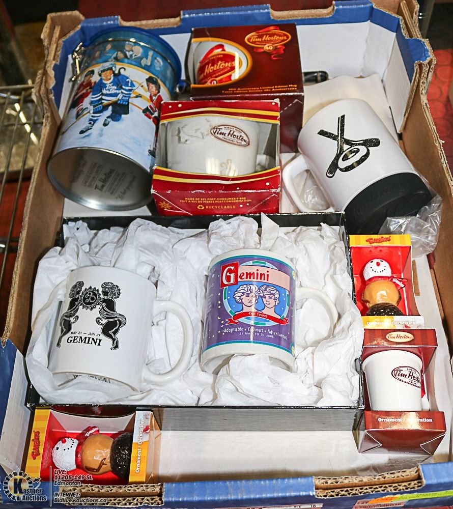 CANISTER, 3 TIM HORTONS COFFEE CUPS (INCL. HOCKEY DESIGN), 3 COLLECTIBLES AND 2 NEW ASTROLOGY GEMINI COFFEE CUPS