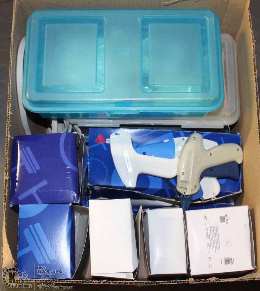 BOX WITH PLASTIC PRICE TAG FASTENER GUN & MORE