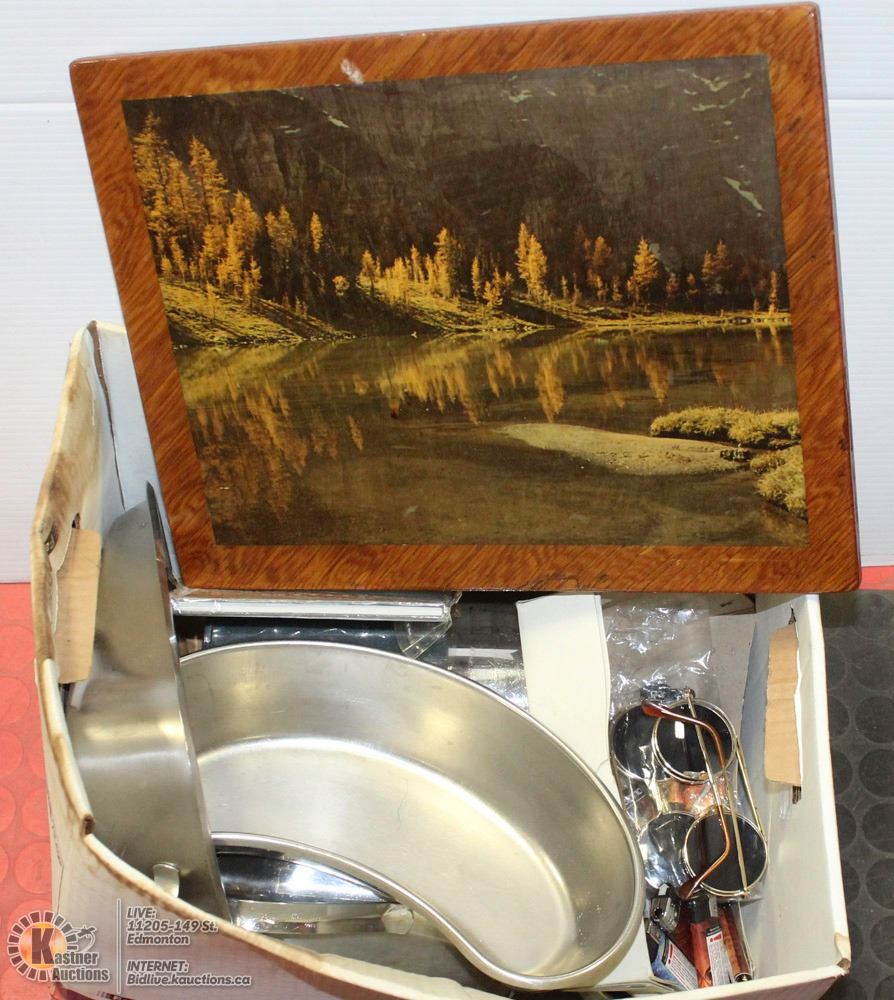 BOX WITH STAINLESS STEEL BED PANS, LIGHTERS ETC