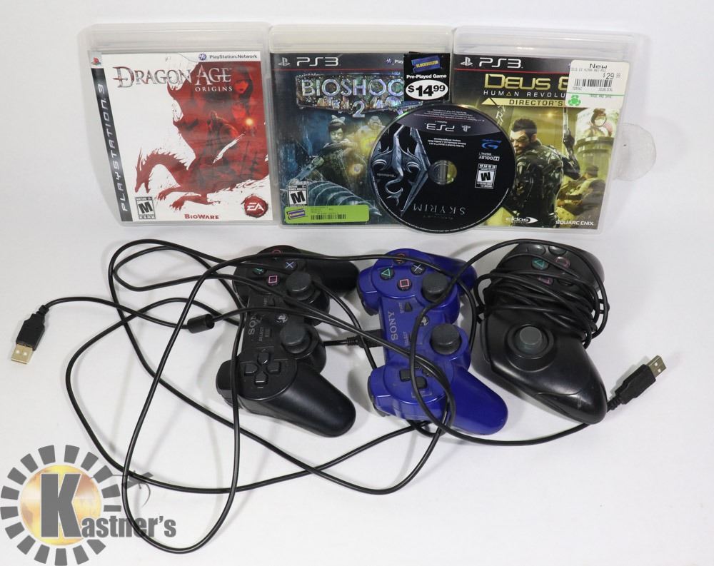 RECHARGEABLE REMOTE CONTROLLERS WITH CHARGE CORD AND 4 PS3 GAMES - DRAGON AGE ORGINS, BIO CHOCK, DUES EX, SKYRIM - GENERAL, ELECTRONICS