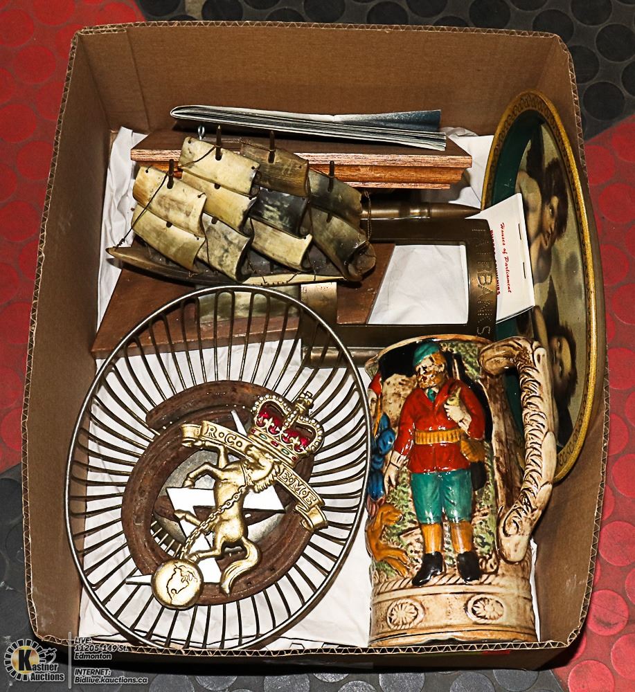 PLAQUE, SHELL BOAT, HORSE SHOES, BULLET PICTURE FRAME, PITCHER, ETC. - COLLECTIBLES