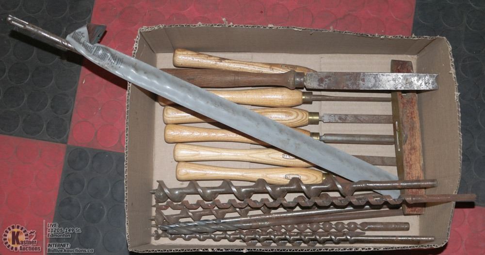 BOX WOOD CHISELS AND EXTRA LONG DRILL BITS.
