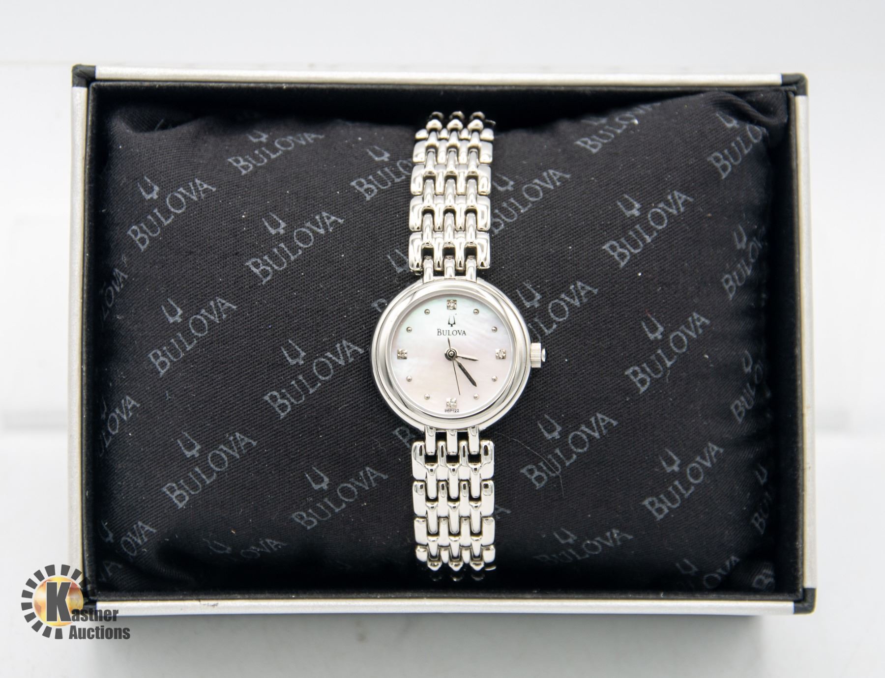 DIAMOND ACCENT AND MOTHER OF PEARL DIAL STAINLESS STEEL COMES WITH ORIGINAL BOX AND BRAND NEW BATTERY MSRP $250.00 **ALL ITEMS MUST BE REMOVED BY 5PM SATURDAY, DECEMBER 16TH 2023. ALL REMAINING ITEMS WILL BE SUBJECT TO A $6.00 PER DAY STORAGE CHARGE. ANY ITEMS REMAINING AFTER TUESDAY, JANUARY 2ND 2023 WILL BE CONSIDERED FORFEITED. NO REFUNDS WILL BE ISSUED FOR FORFEITED ITEMS. TO SCHEDULE A PICK UP APPOINTMENT CLICK HERE