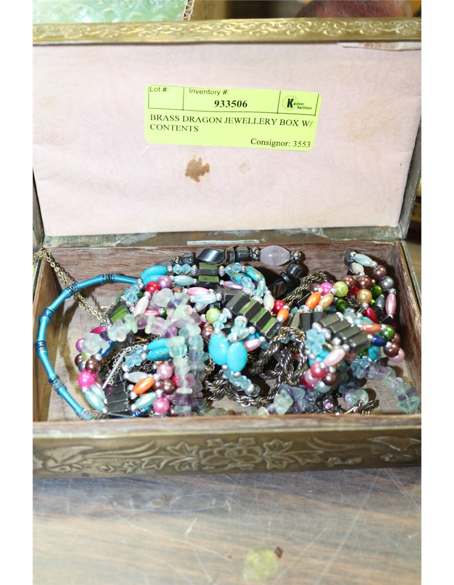 BRASS DRAGON JEWELLERY BOX W/ CONTENTS