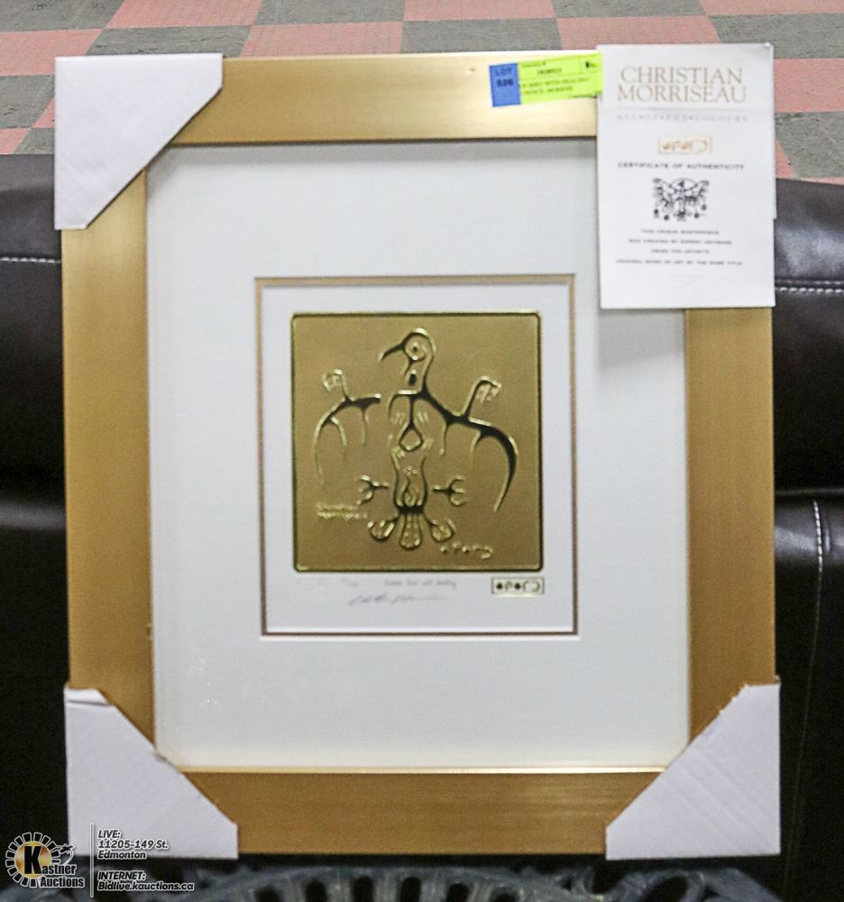 SIGNED IN PENCIL BY CHRISTIAN MORRISEAU (SON OF NORVAL), COMES WITH COA AND BIO AT THE BACK OF THE FRAME, WITH GALLERY STAMP, CREE SYLLABICS STAMPED, FRAME SIZE 16.5 X 19 INCHES.