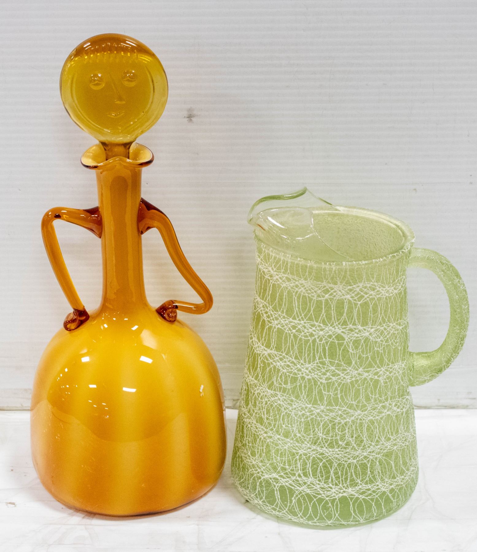 ART GLASS 10 INCH PITCHER HAND BLOWN GREEN AND WHITE SWIRL **ALL ITEMS MUST BE REMOVED BY 5PM SATURDAY, DECEMBER 9TH 2023. ALL REMAINING ITEMS WILL BE SUBJECT TO A $6.00 PER DAY STORAGE CHARGE. ANY ITEMS REMAINING AFTER THURSDAY, DECEMBER 21ST 2023 WILL BE CONSIDERED FORFEITED. NO REFUNDS WILL BE ISSUED FOR FORFEITED ITEMS. TO SCHEDULE A PICK UP APPOINTMENT CLICK HERE