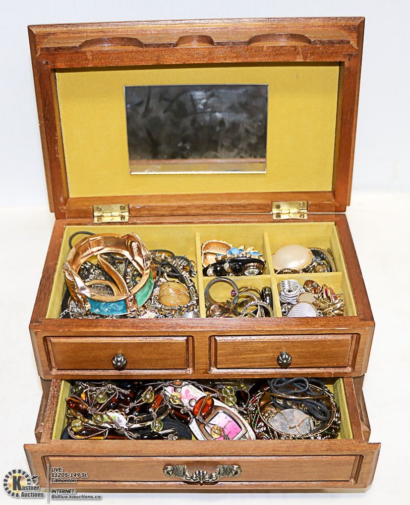 BROWN MUSIC BOX FULL OF JEWELRY