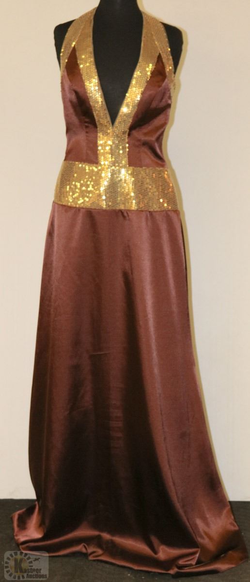 BROWN WITH GOLD SEQUINED HALTER TOP DRESS