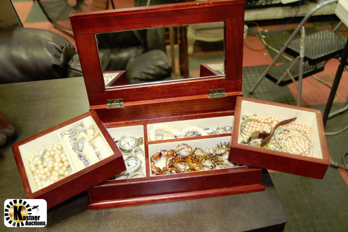 BROWN WOOD JEWELLERY BOX W/CONTENTS