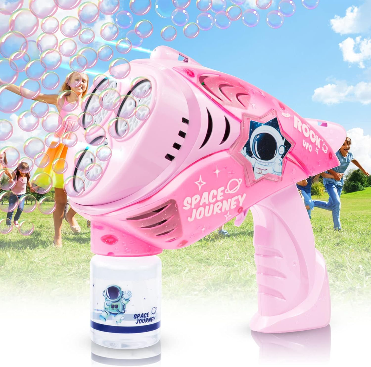 Bubble Gun for Kids - Pisale Space Bubble Machine with Lights, Automatic Bubble Maker 360 Degree Leak Proof Design, Bubble Blower Toy for Wedding Outdoor Birthday Party (Pink)