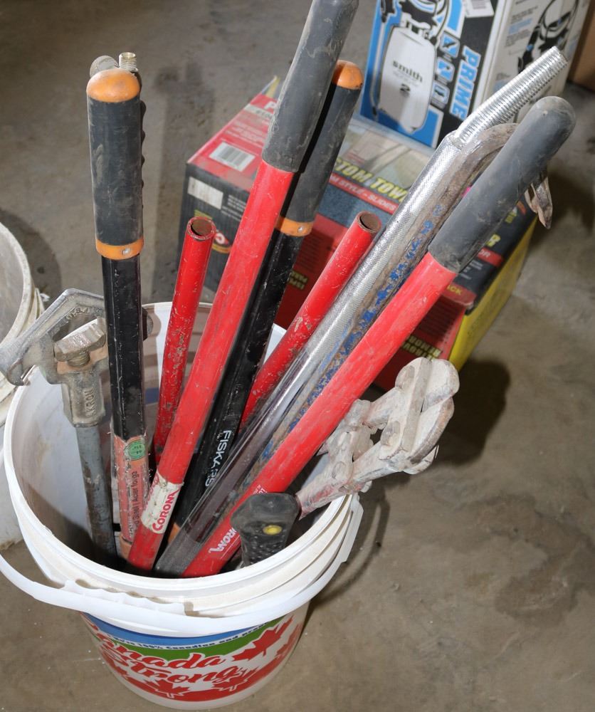 BUCKET OF VARIOUS TOOLS: INCLUDES CUTTERS,