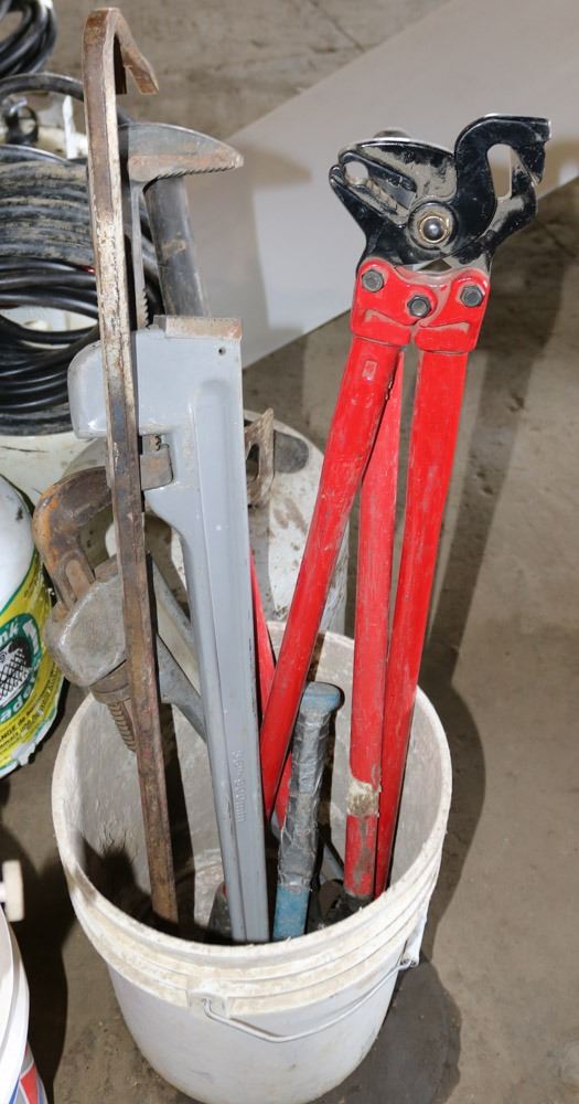 BUCKET OF VARIOUS TOOLS: INCLUDES CUTTERS,