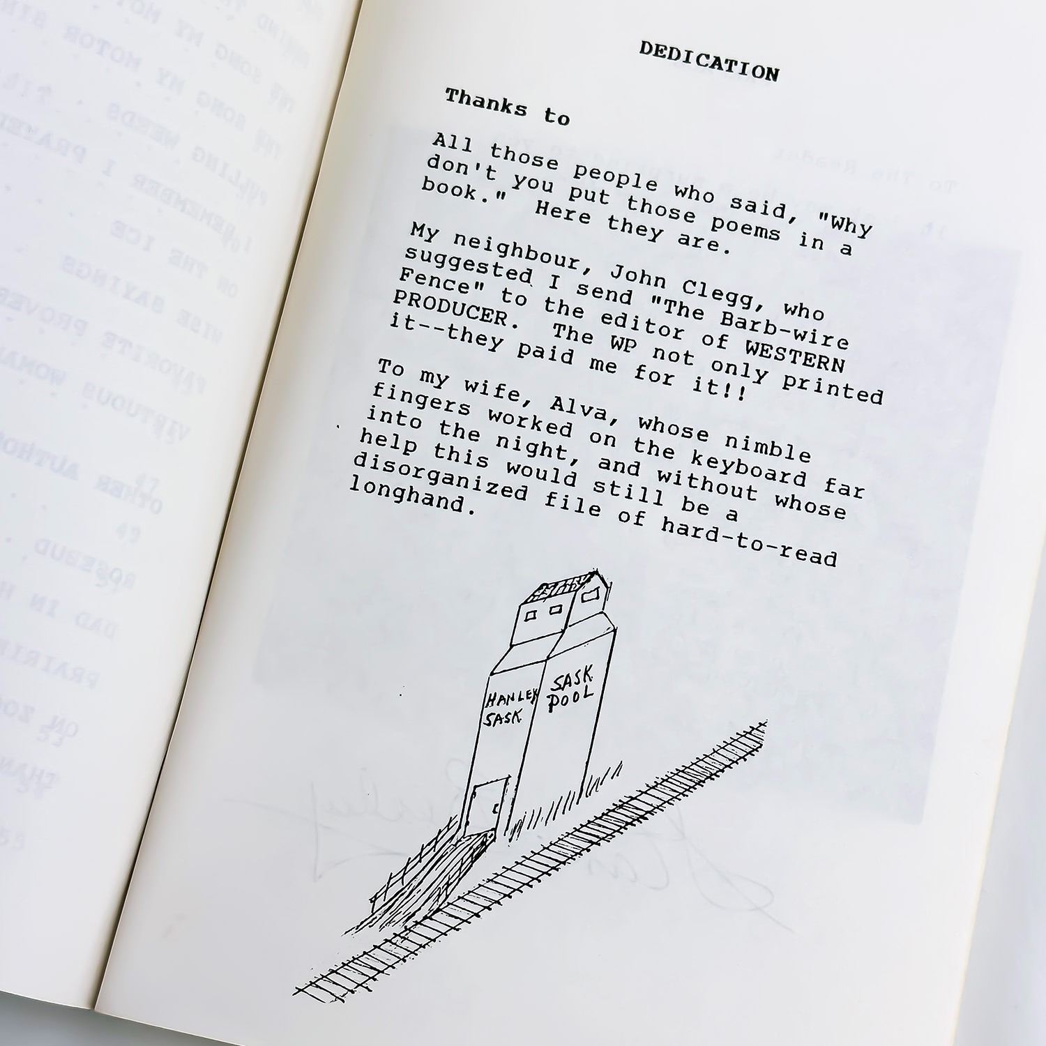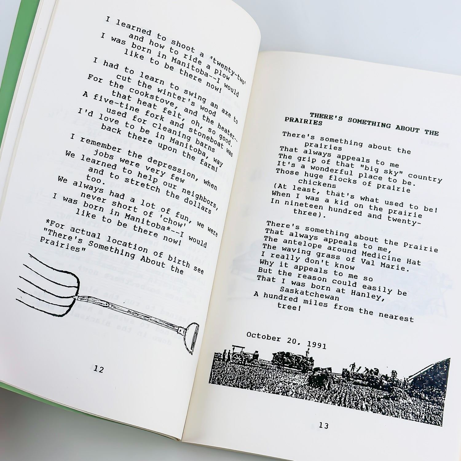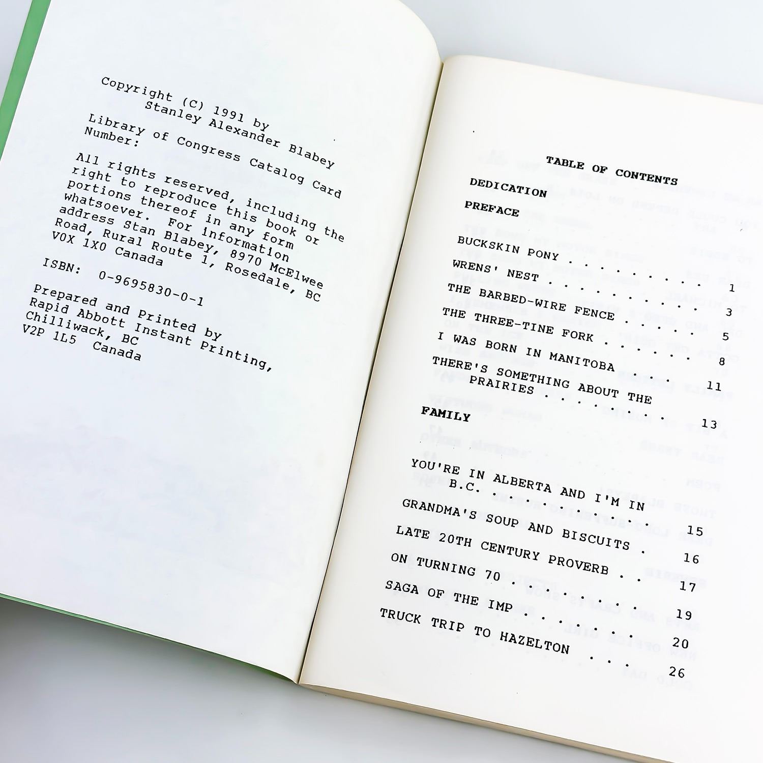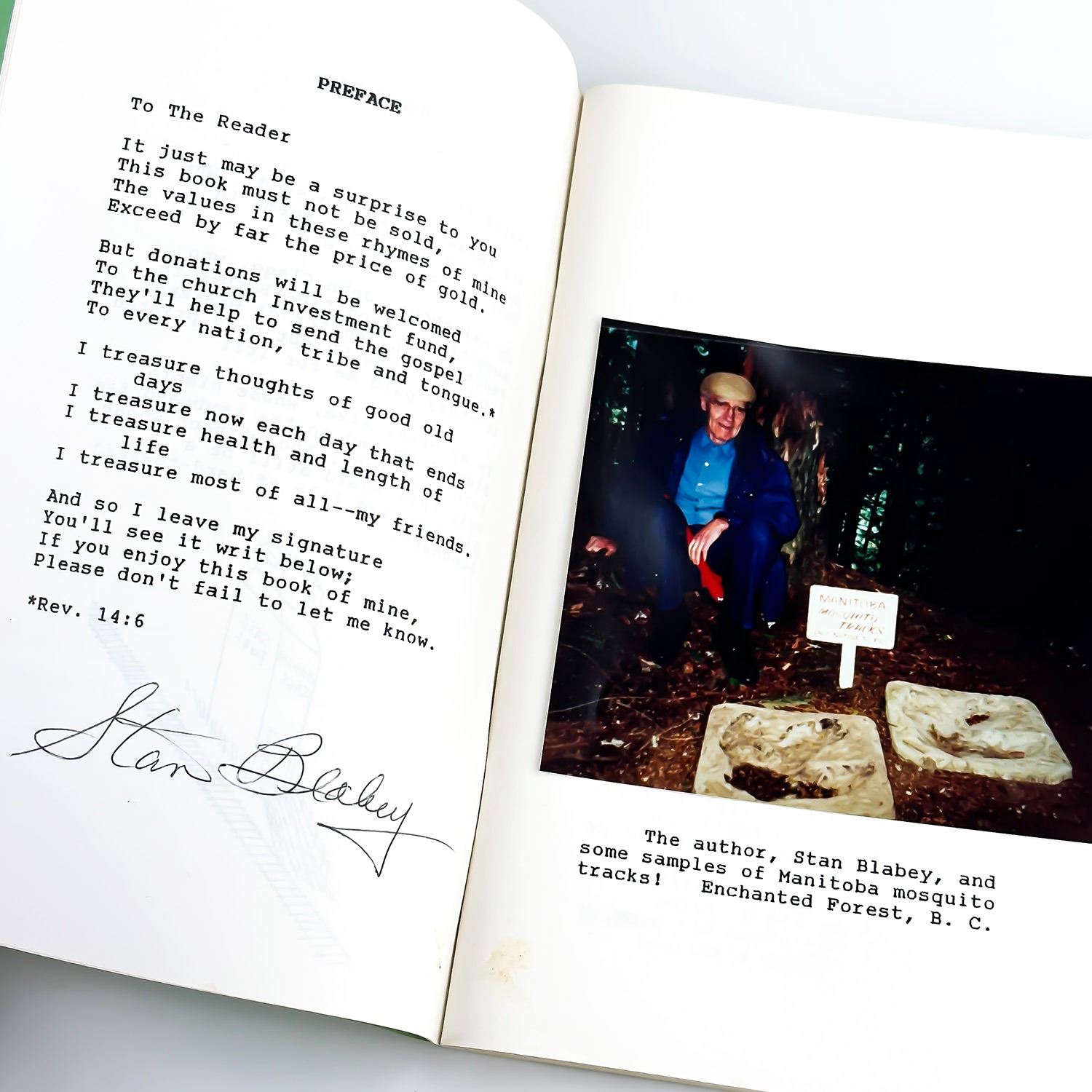#8547 - HAND SIGNED BOOK BY STAN BLABEY, ALONG WITH AN ACTUAL PHOTOGRAPH AFFIXED INSIDE - MANITOBA MOSQUITO TRACKS, ENCHANTED FOREST, B.C. STAN BLABEY, ROSEDALE BC - PUBLISHED IN CHILLIWACK, BC. COPYRIGHT 1991 - PAPERBACK MEASURES: 8.5” X 5.5” - 96 PAGES.