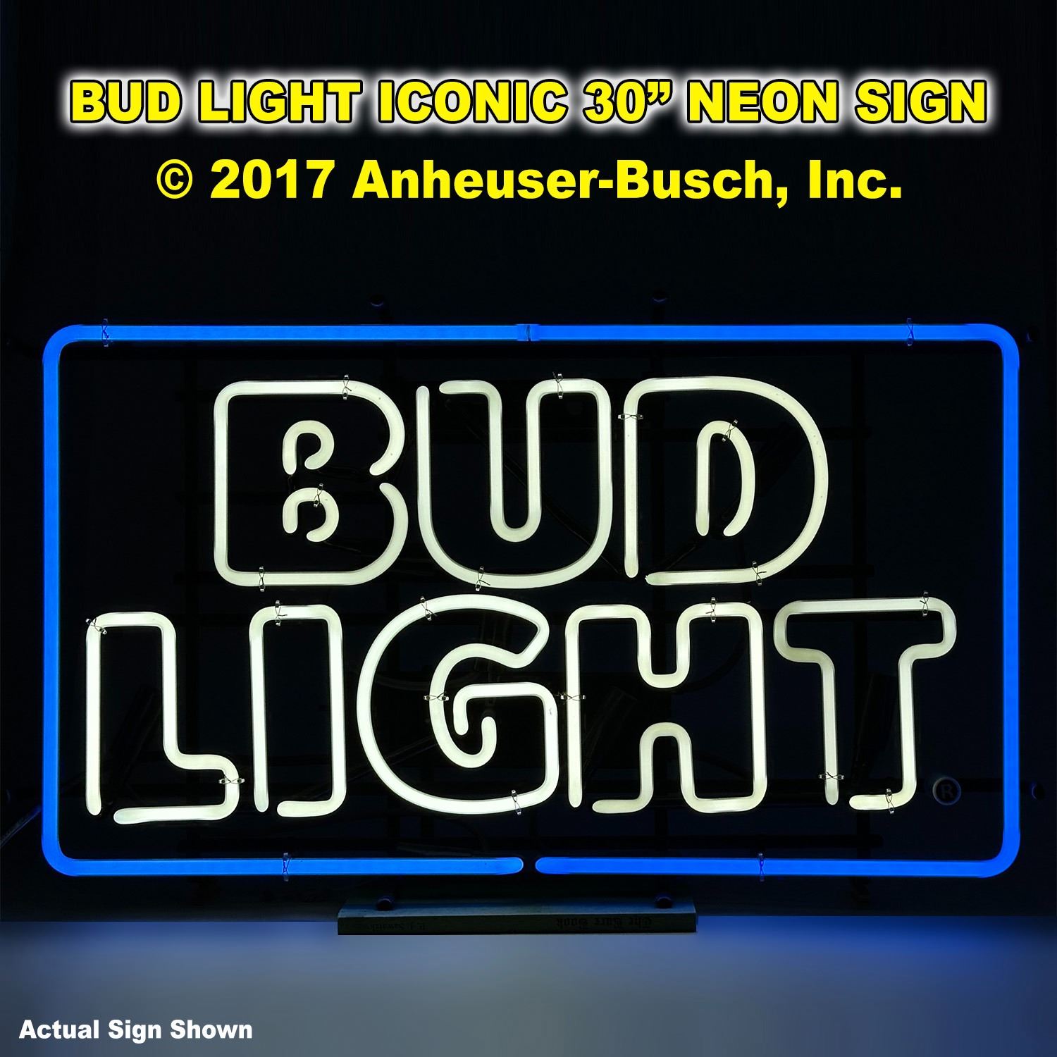 #8001 - 30” BUD LIGHT BEER NEON SIGN - ANHEUSER-BUSCH 2017. HOME BAR DECOR BEER ADVERTISING. MEASURES: 30” (76 CM) WIDE BY 17” (43 CM) TALL AND 5.5” (14 CM) DEEP