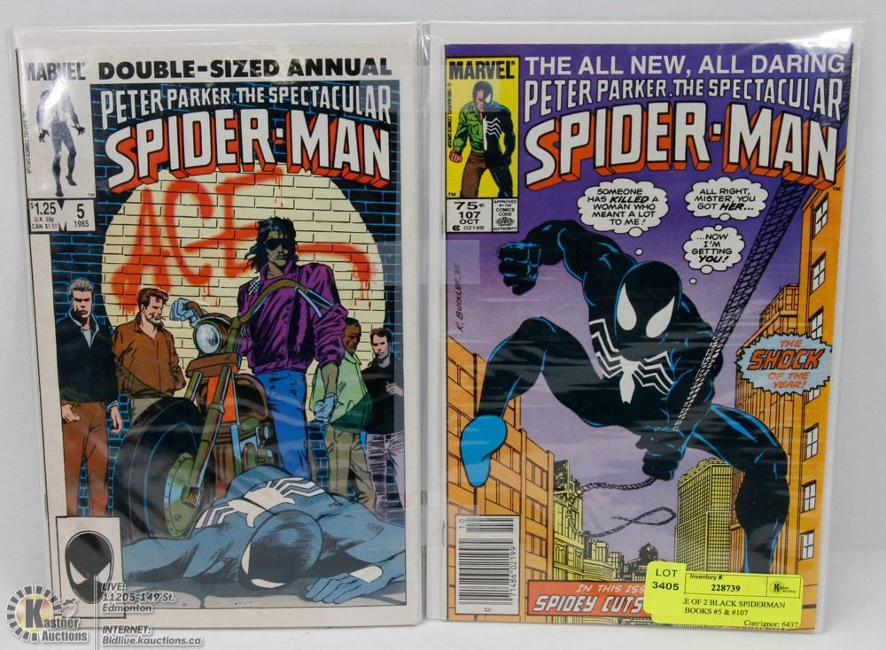 BUNDLE OF 2 BLACK SPIDERMAN COMIC BOOKS #5 & #107