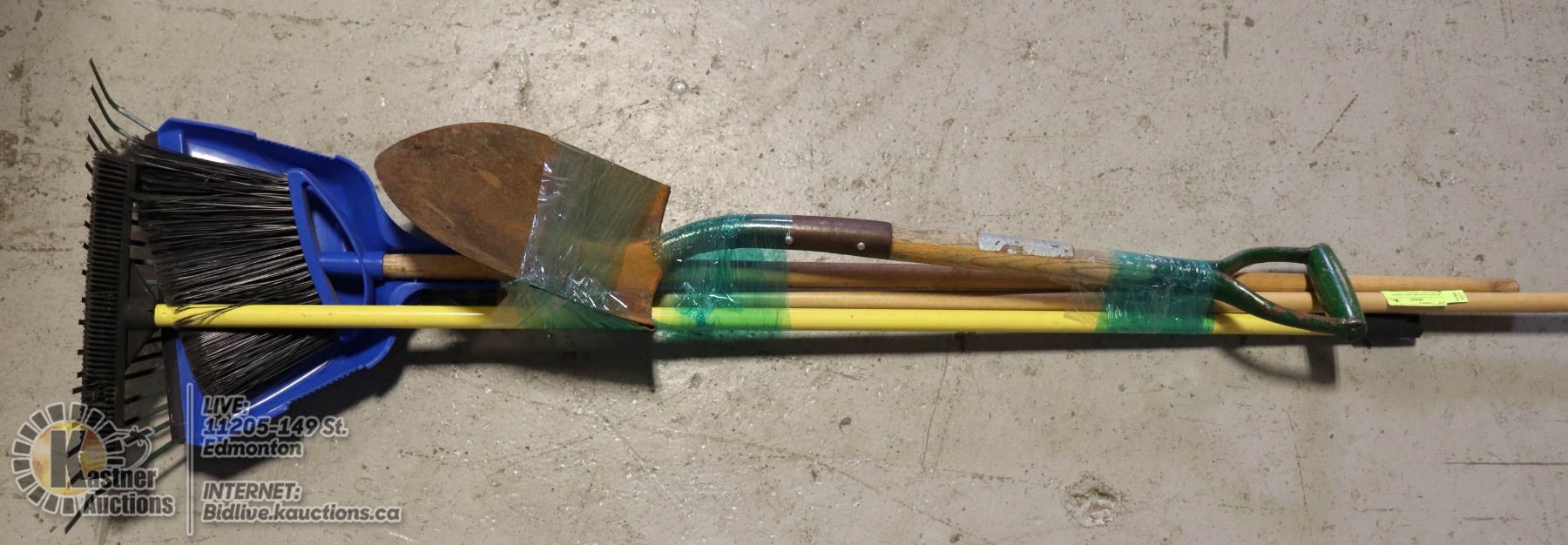 SHOVEL, LEAF RAKE, BROOM AND PAN SET, SCRUBBER