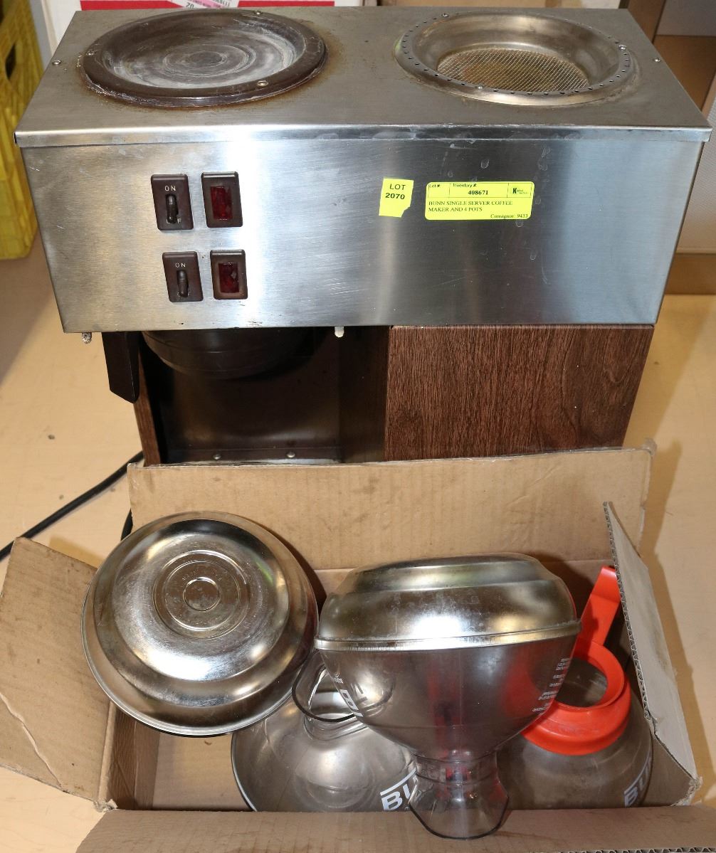 BUNN SINGLE SERVER COFFEE MAKER AND 4 POTS