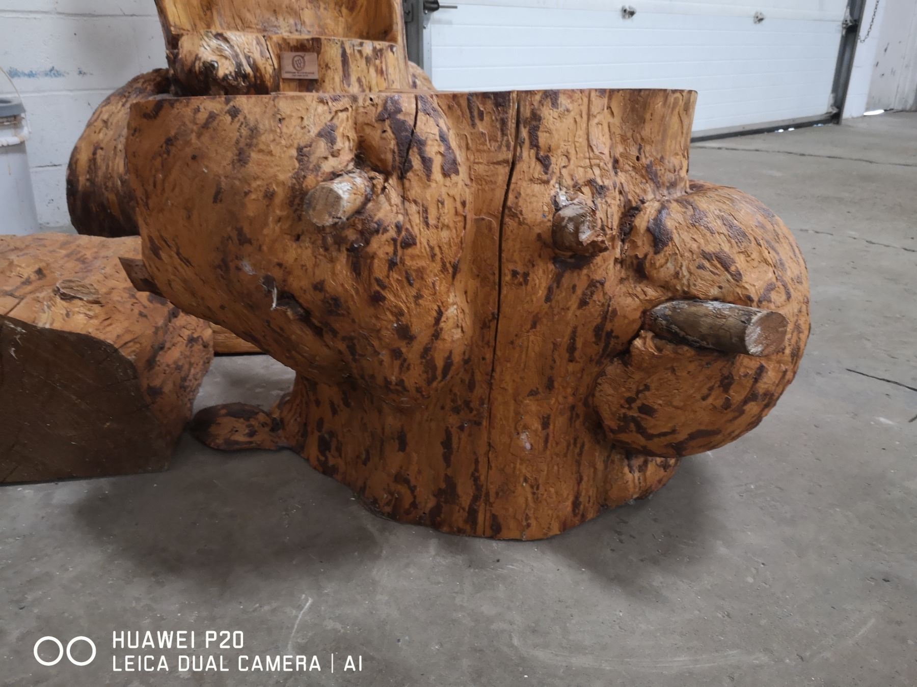 STOOLS AND TABLE. 1ST CHAIR 66" TALL, SECOND CHAIR 57" TALL, TABLE 30" X 29" X 19" MADE BY OMU CUSTOM WOODWORKS. THIS TREE LIVED IN HINTON AND FELL THE WINTER OF 2017. THE RINGS SHOW 130+ YEARS OF LIFE!