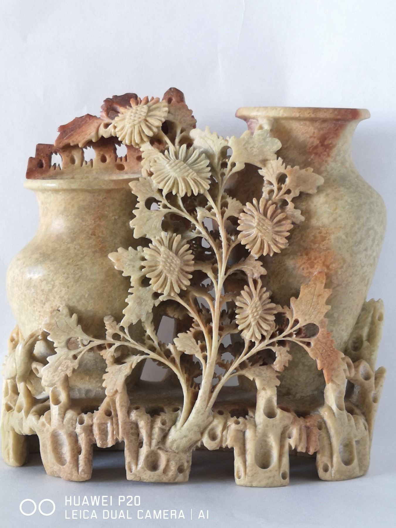 BURMESE JADE CARVED SUNFLOWER AND POTS SCULPTURE