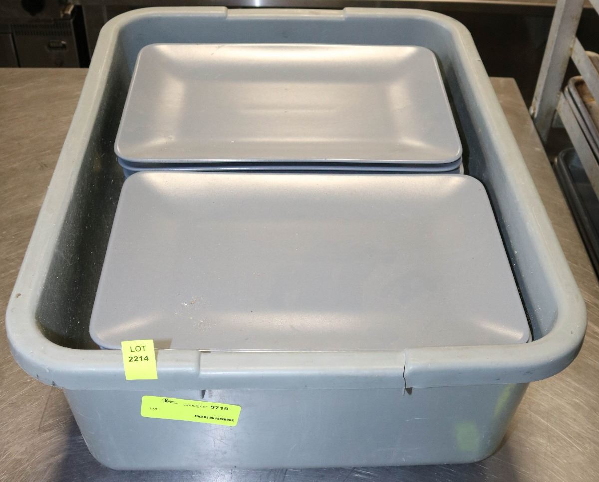 BUS PAN FULL OF GREY RECTANGULAR PLATES