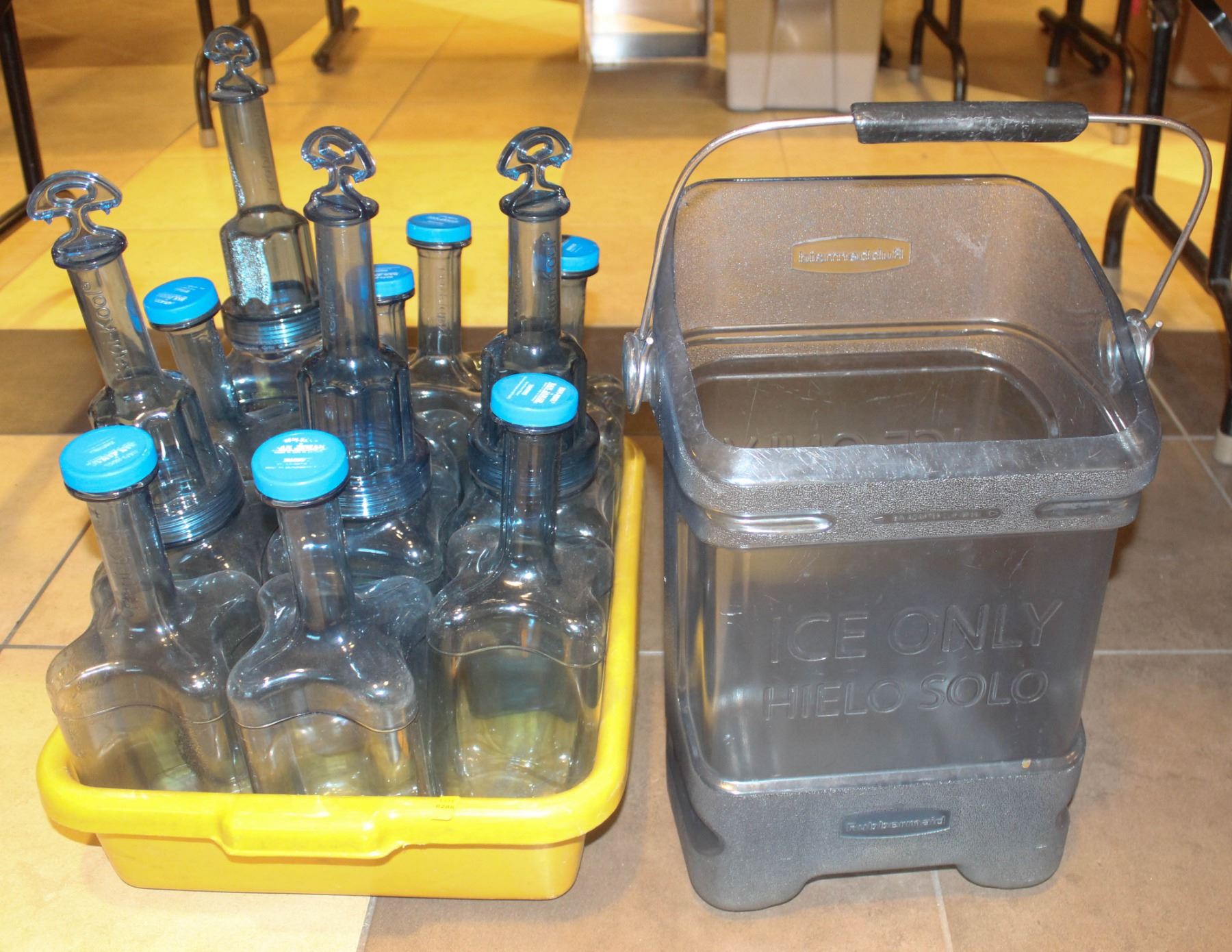 BUS TRAY OF ICE WANDS AND RUBBERMAID ICE BUCKET