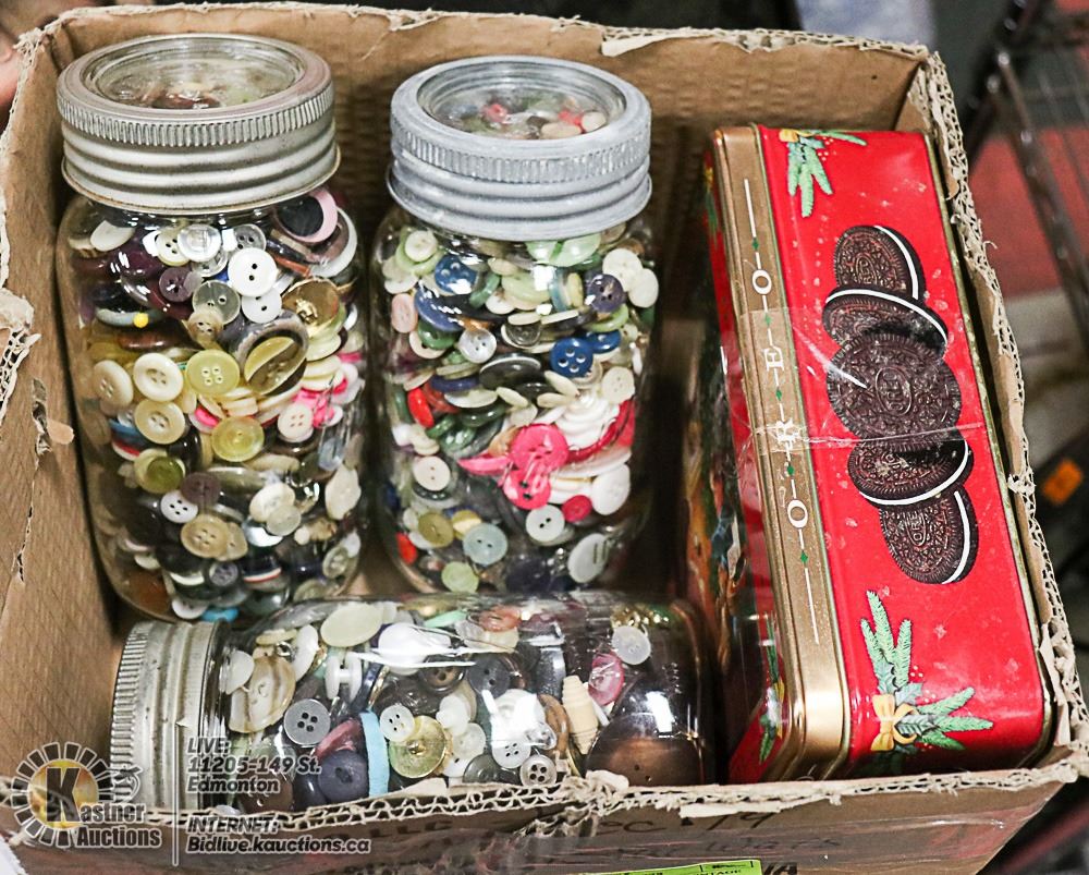 BUTTONS- LARGE LOT IN VINTAGE JARS AND TINS