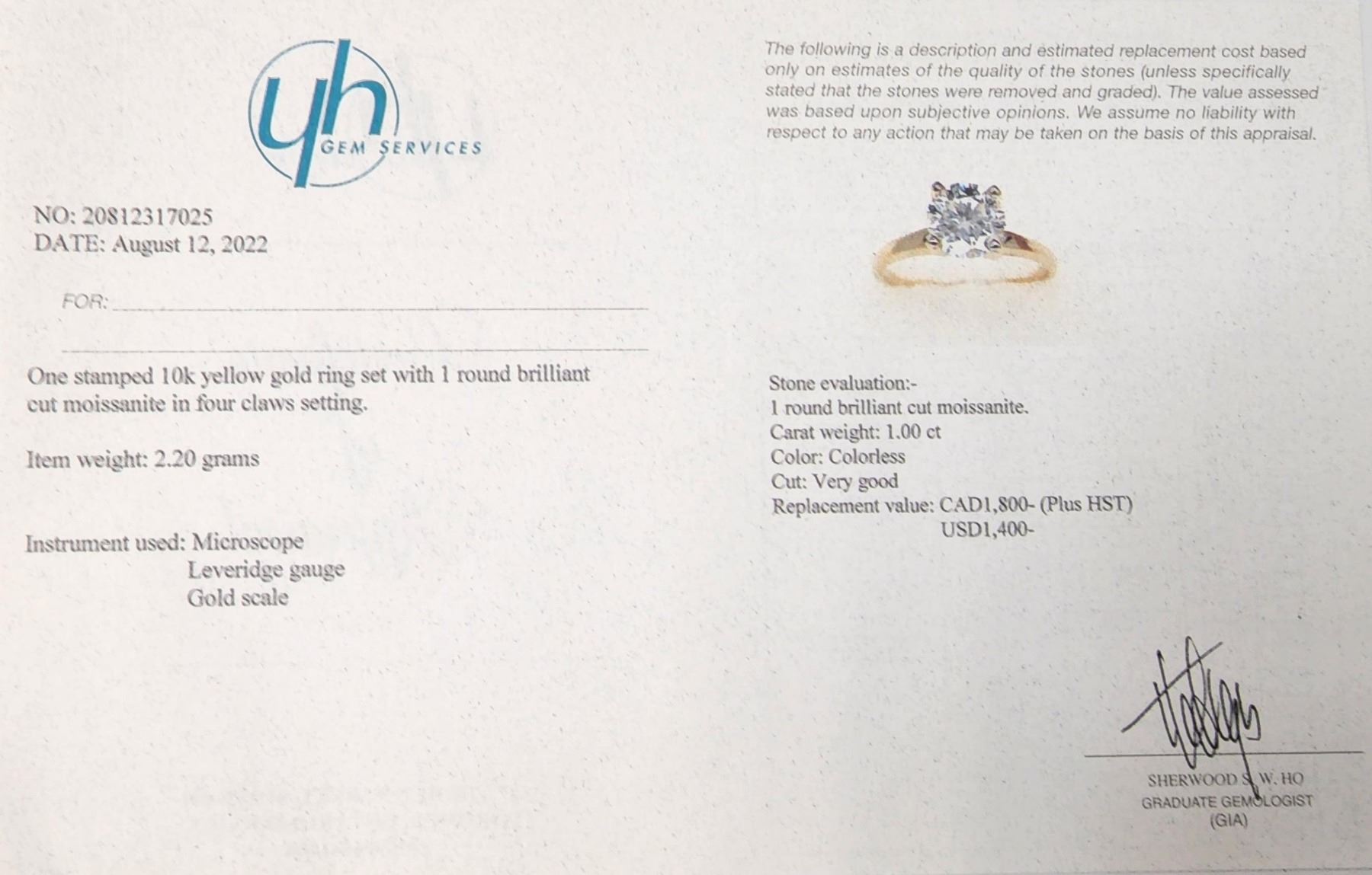 10K YELLOW GOLD, WHITE MOISSANITE(1CT) RING SIZE 6.5, WEIGHT 2.2G, MADE IN CANADA, APPRAISED RETAIL $1800 **ALL ITEMS MUST BE REMOVED BY 5PM SATURDAY, MAY 27TH 2023. ALL REMAINING ITEMS WILL BE SUBJECT TO A $6.00 PER DAY STORAGE CHARGE. ANY ITEMS REMAINING AFTER MONDAY, JUNE 12TH, 2023 WILL BE CONSIDERED FORFEITED. NO REFUNDS WILL BE ISSUED FOR FORFEITED ITEMS. TO SCHEDULE A PICK UP APPOINTMENT CLICK HERE