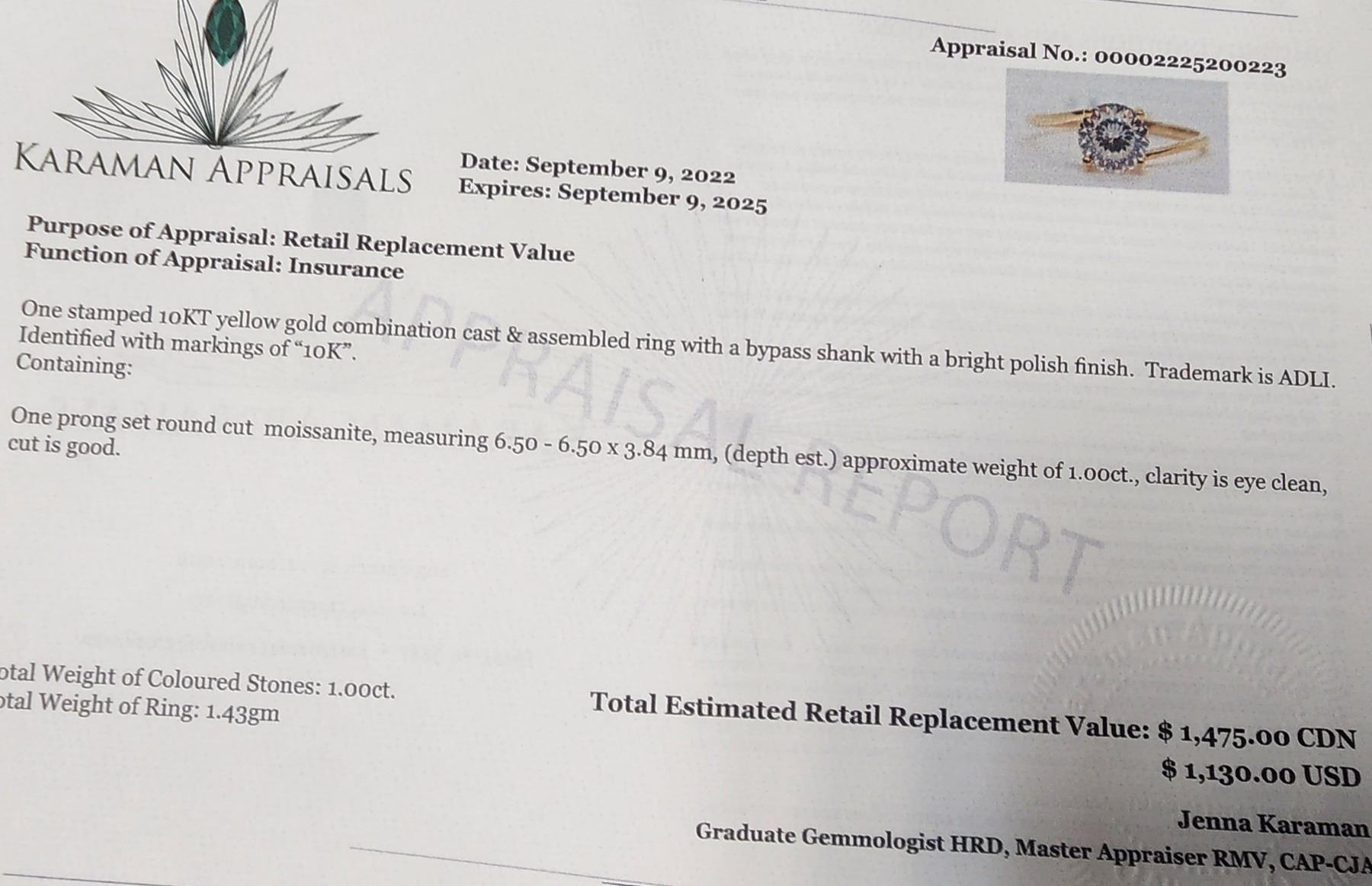 10K YELLOW GOLD, WHITE MOISSANITE(1CT) RING SIZE 6.5, WEIGHT 1.43G, MADE IN CANADA, APPRAISED RETAIL $1475 **ALL ITEMS MUST BE REMOVED BY 5PM SATURDAY, FEBRUARY 11TH 2023. ALL REMAINING ITEMS WILL BE SUBJECT TO A $6.00 PER DAY STORAGE CHARGE. ANY ITEMS REMAINING AFTER MONDAY, FEBRUARY 27TH, 2023 WILL BE CONSIDERED FORFEITED. NO REFUNDS WILL BE ISSUED FOR FORFEITED ITEMS. TO SCHEDULE A PICK UP APPOINTMENT CLICK HERE
