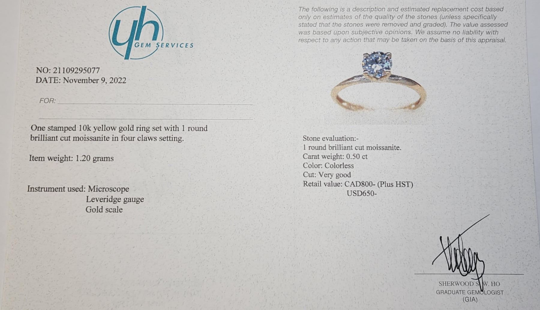 10K YELLOW GOLD, WHITE MOISSANITE (0.5CT) RING SIZE 6.5,WEIGHT 1.2G, MADE IN CANADA, APPRAISED RETAIL $800 **ALL ITEMS MUST BE REMOVED BY 5PM SATURDAY, FEBRUARY 18TH 2023. ALL REMAINING ITEMS WILL BE SUBJECT TO A $6.00 PER DAY STORAGE CHARGE. ANY ITEMS REMAINING AFTER MONDAY, MARCH 6TH, 2023 WILL BE CONSIDERED FORFEITED. NO REFUNDS WILL BE ISSUED FOR FORFEITED ITEMS. TO SCHEDULE A PICK UP APPOINTMENT CLICK HERE
