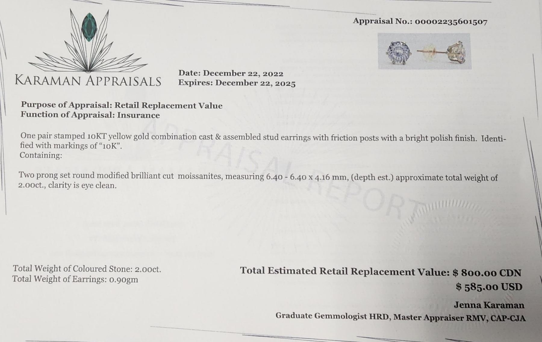 10K YELLOW GOLD WHITE MOISSANITE (2CT) EARRINGS WEIGHT 0.9G, MADE IN CANADA, APPRAISED RETAIL $800 **ALL ITEMS MUST BE REMOVED BY 5PM SATURDAY, JULY 29TH 2023. ALL REMAINING ITEMS WILL BE SUBJECT TO A $6.00 PER DAY STORAGE CHARGE. ANY ITEMS REMAINING AFTER MONDAY, AUGUST 14TH, 2023 WILL BE CONSIDERED FORFEITED. NO REFUNDS WILL BE ISSUED FOR FORFEITED ITEMS. TO SCHEDULE A PICK UP APPOINTMENT CLICK HERE