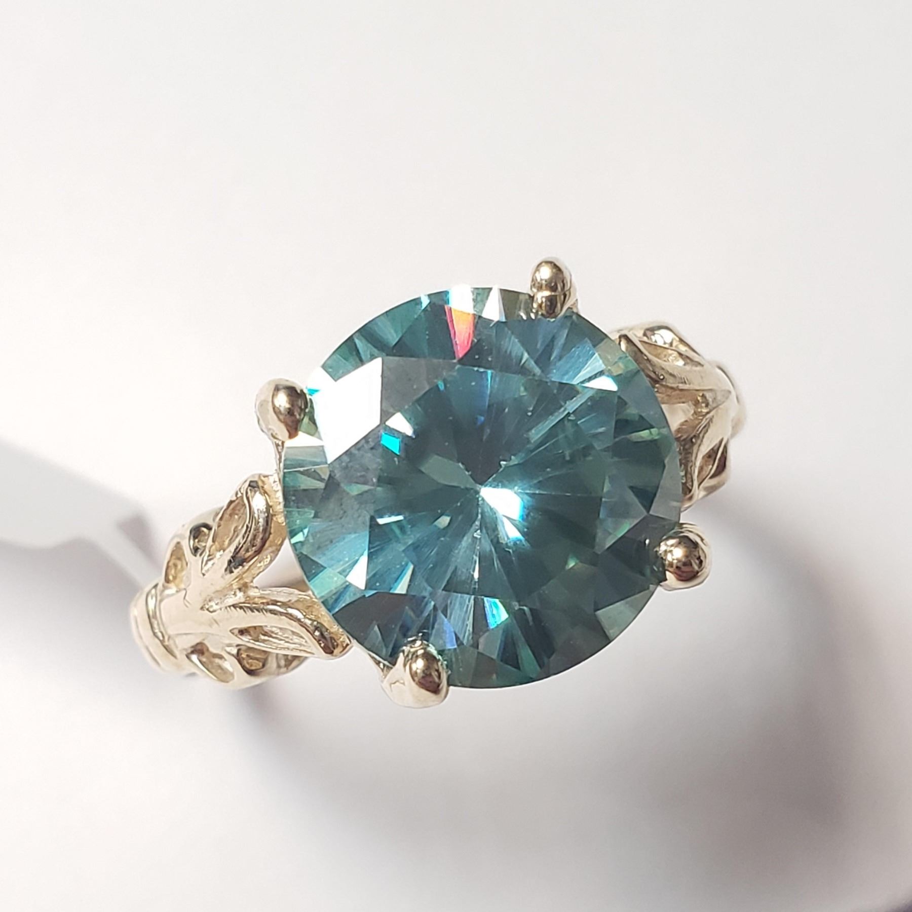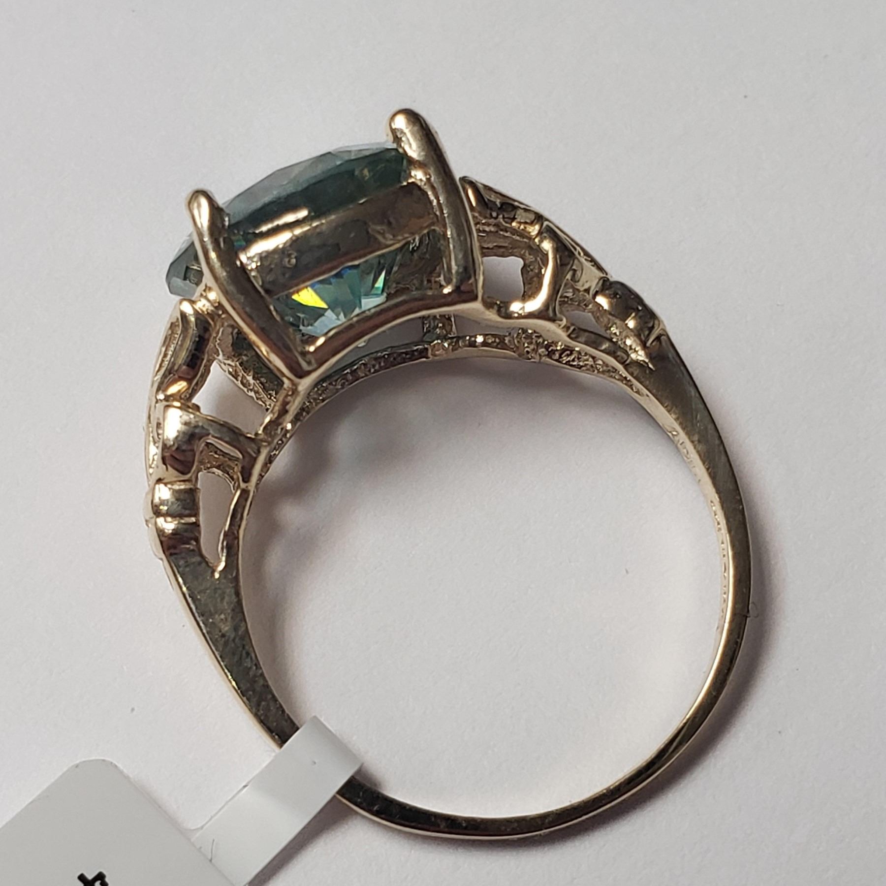 10K YELLOW GOLD VIVID GREENISH BLUE MOISSANITE(4.2CT) RING (~SIZE 6)(RING IS RESIZABLE FOR $40) (~WEIGHT 3.47G), MADE IN CANADA, APPRAISED RETAIL $2540