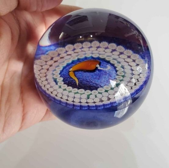 PAPERWEIGHT – CIG. THIS PAPERWEIGHT HAS FOUR CONCENTRIC RINGS OF MILLEFIORI CANES AROUND CENTRAL IMAGE OF A CURVED PIPE WITH SMOKE CURLING UPWARDS. THE DESIGN IS PLACED ON A TRANSLUCENT BLUE GROUND. IT IS SIGNED AND DATED ON THE BOTTOMWITH THE WHITEFRIARS SIGNATURE CANE FEATURING A WHITE FRIAR SILHOUETTE AND THE DATE 1987. THE PAPERWEIGHT IS FACETED WITH ONE LARGE TOP FACET AND SIX SMALLER SIDE FACETS. IT WAS ISSUED BY CAITHNESS GLASS UNDER THE WHITEFRIARS LABEL IN1987 TO CELEBRATE THE 100TH ANNIVERSARY OF THE PUBLICATION OF THE FIRST SHERLOCK HOLMES STORY “A STUDY IN SCARLET” IN BEETON’S CHRISTMAS ANNUAL IN 1887. A WONDERFUL PAPERWEIGHT THAT EVERY WHITEFRIARS OR HOLMES FAN SHOULD COVET.