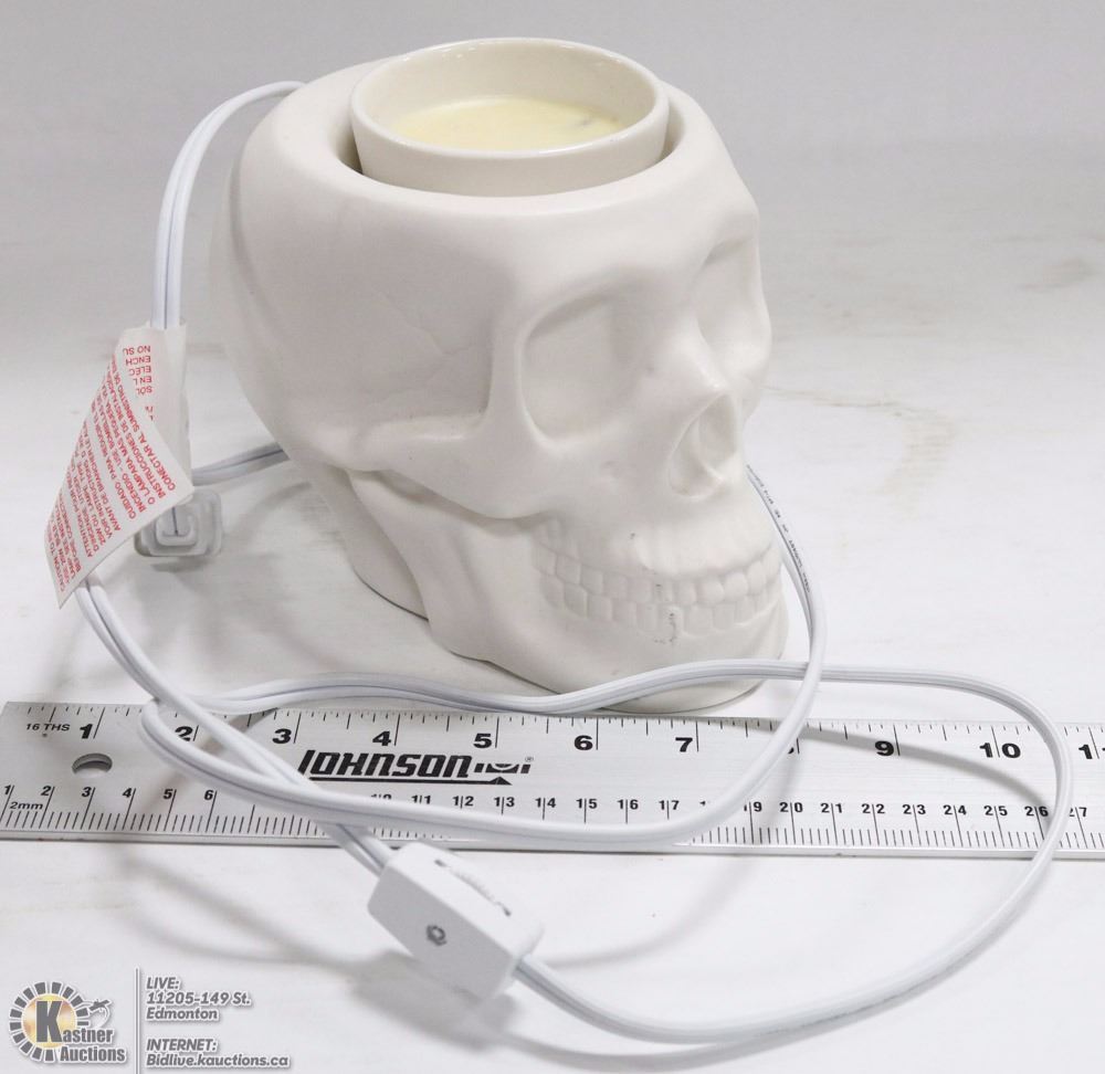 MADE OF PORCELAIN PLUGS IN TO HEAT WAX AND LIGHT UP THE SKULL