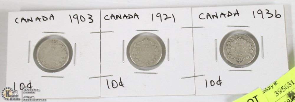 CANADA 1903, 1921 AND 1936 TEN CENT COINS