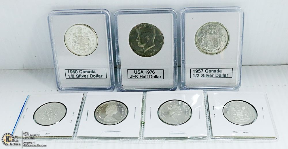 2 - CANADA SILVER $.50 1957 - 1960, 4- CAN. 1980'S CAMEO HALVES, AND A 1976 JFK HALF DOLLAR