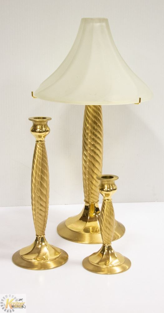 HEAVY BRASS SET WITH 2 CANDLE HOLDERS AND 1 LAMP